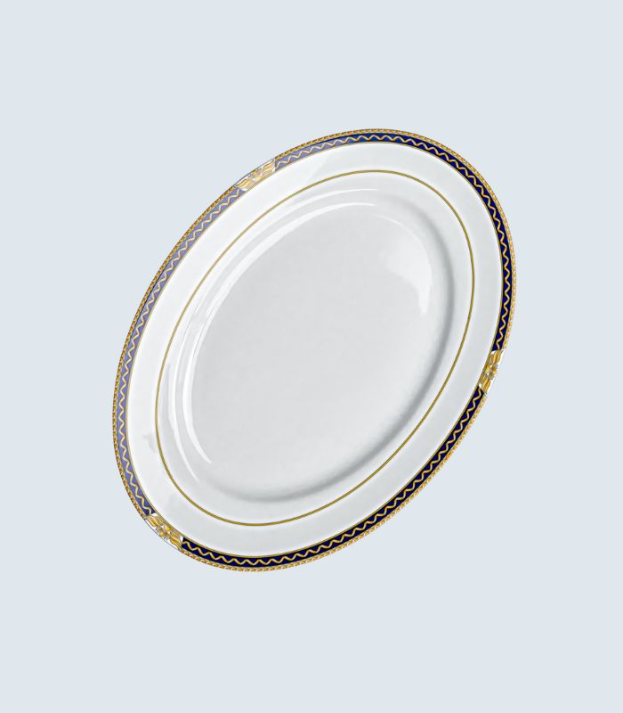 Løft borddekkingen med et servise som kombinerer moderne eleganse med klassisk herskapelighet. Dette eksklusive porselensserviset har et tidløst mønster i dyp kongeblå farge, vakkert innrammet av detaljer malt i gul – ikke gull – for et raffinert, men nedtonet uttrykk.