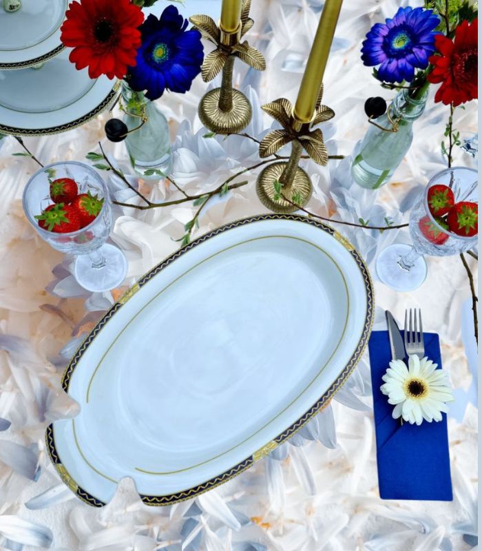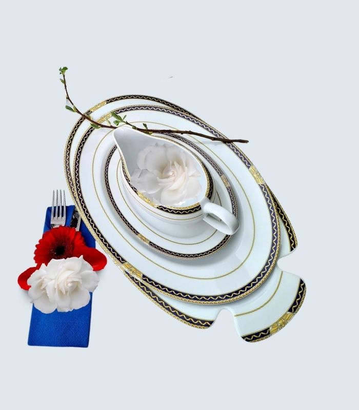 Løft borddekkingen med et servise som kombinerer moderne eleganse med klassisk herskapelighet. Dette eksklusive porselensserviset har et tidløst mønster i dyp kongeblå farge, vakkert innrammet av detaljer malt i gul – ikke gull – for et raffinert, men nedtonet uttrykk.
