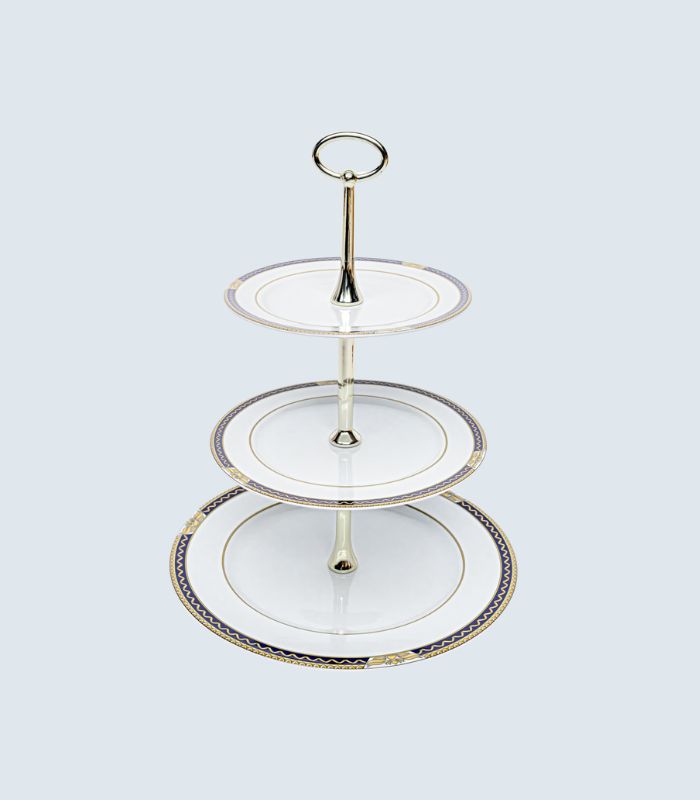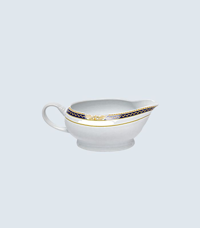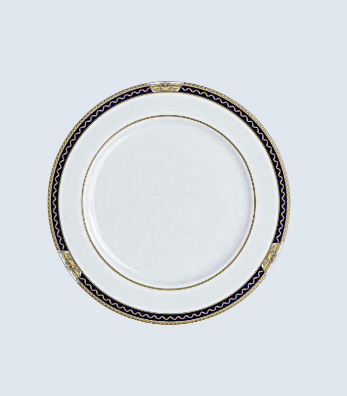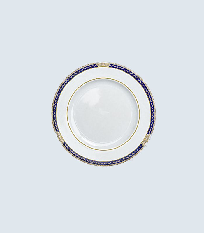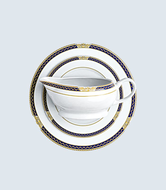 Løft borddekkingen med et servise som kombinerer moderne eleganse med klassisk herskapelighet. Dette eksklusive porselensserviset har et tidløst mønster i dyp kongeblå farge, vakkert innrammet av detaljer malt i gul – ikke gull – for et raffinert, men nedtonet uttrykk.