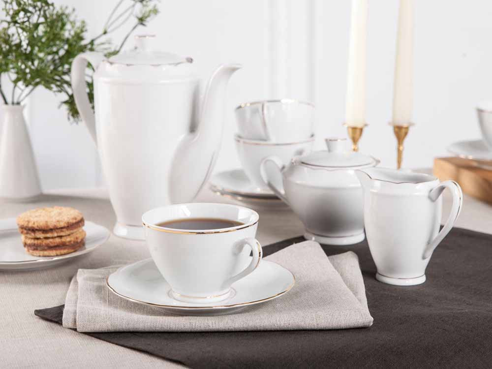 Feston er et nydelig servise i snøhvitt, benporselen med håndmalte kanter i ekte gull. Designklassiker til den beste prisen!