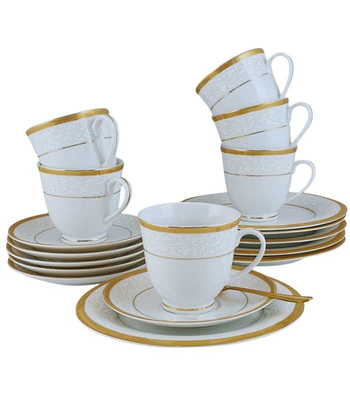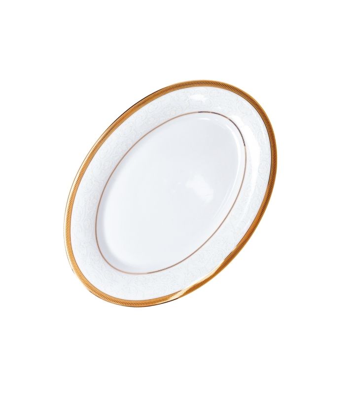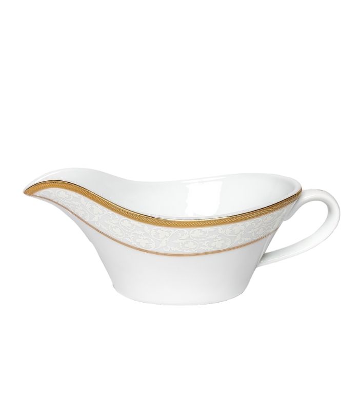 Forvandle dine måltider til elegante opplevelser med dette utsøkte servisesettet. Hver del er laget av fineste porselen, dekorert med et nydelig, ton-i-ton bladmønster og innrammet av doble gullkanter som gir et luksuriøst preg. Den glansfulle gullfinishen tilfører bordet en tidløs og sofistikert atmosfære.
