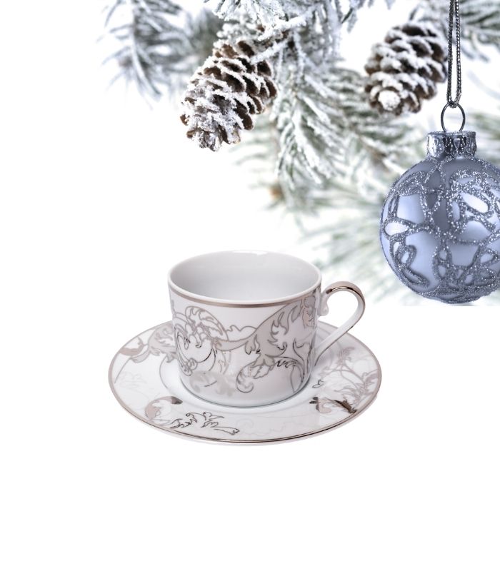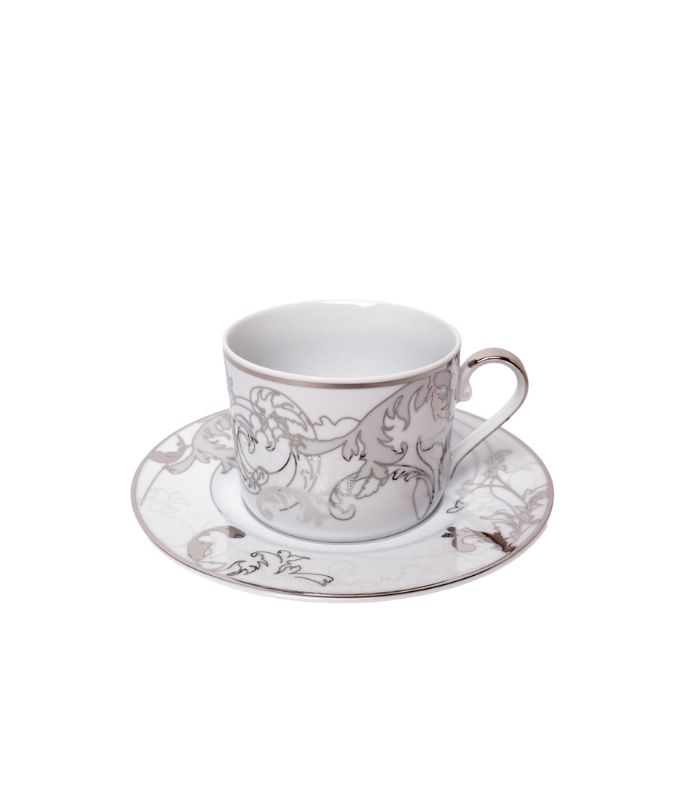 Serviset er laget i høybrent kvalitetsporselen og prydet med delikate, ornamentale mønstre i skinnende platina. Den glatte hvite overflaten danner en elegant kontrast til dekoren, og hver del er omhyggelig utformet for å gi et sofistikert uttrykk til ditt dekkede bord.