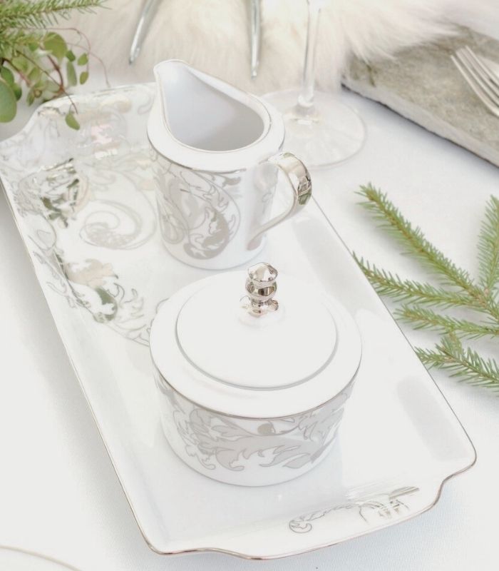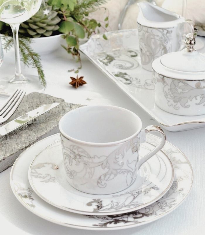 Serviset er laget i høybrent kvalitetsporselen og prydet med delikate, ornamentale mønstre i skinnende platina. Den glatte hvite overflaten danner en elegant kontrast til dekoren, og hver del er omhyggelig utformet for å gi et sofistikert uttrykk til ditt dekkede bord.