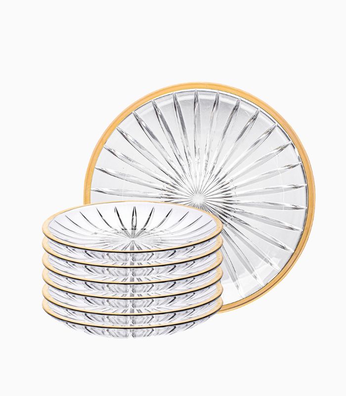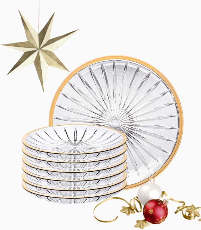 Disse elegante desserttallerkenene fra Venus Gold-serien kombinerer luksus og funksjonalitet i ett tidløst design. Tallerkenene er laget av krystallklart glass med et vakkert, reflekterende stjernemønster og en eksklusiv gullkant som gir en sofistikert glød til borddekkingen.